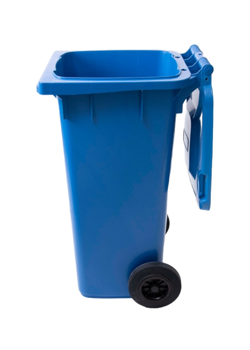 120-liter plastic waste bin made of high-density polyethylene (HDPE/PP) for durability and weather resistance. Equipped with two sturdy rubber wheels for easy mobility, a movable lid, and comfortable handles. UV- and chemical-resistant, compliant with municipal waste management standards, and available in multiple colors for waste segregation.