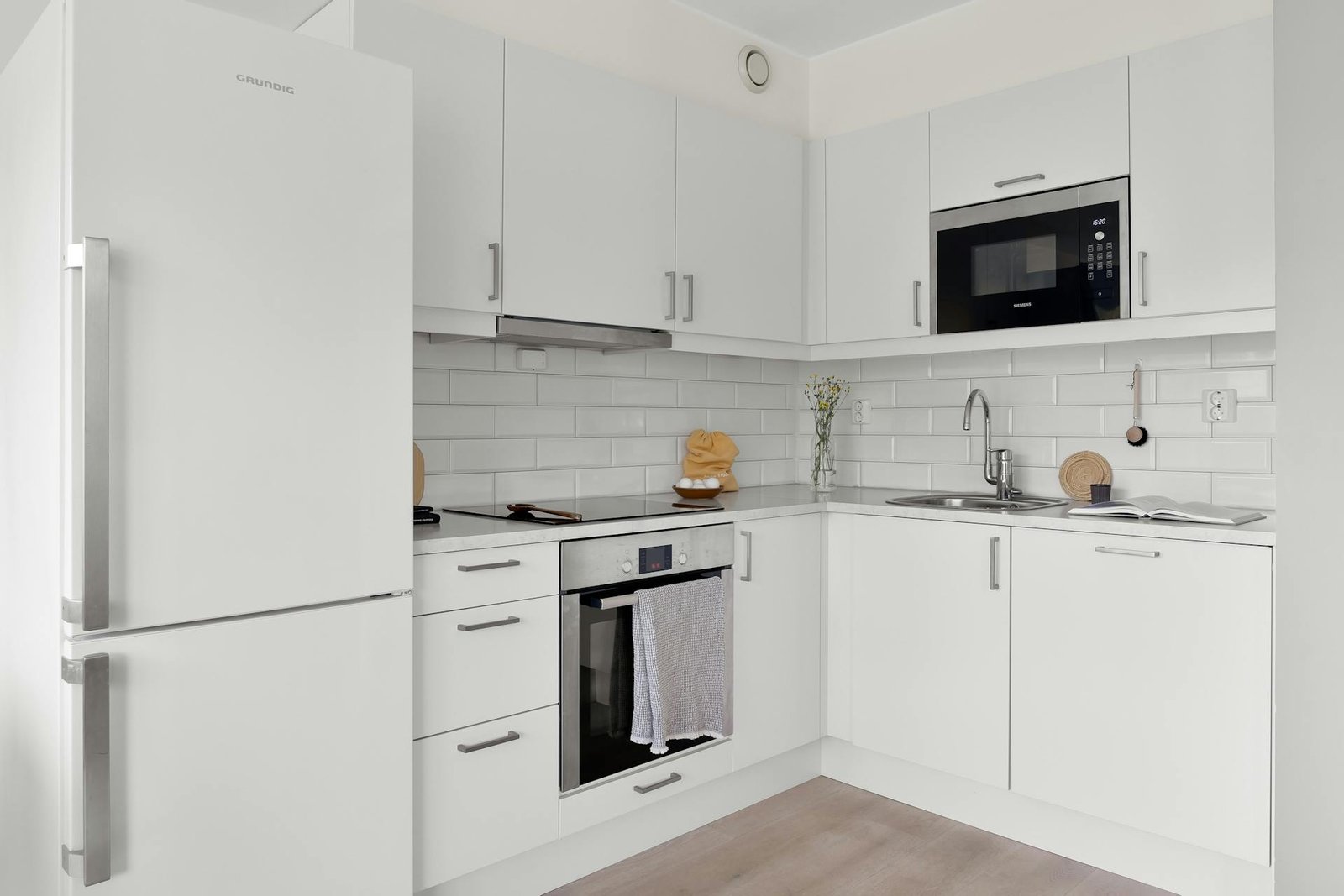 مطبخ ألمنيوم أبيض لامع مع أسطح من الرخام الصناعي