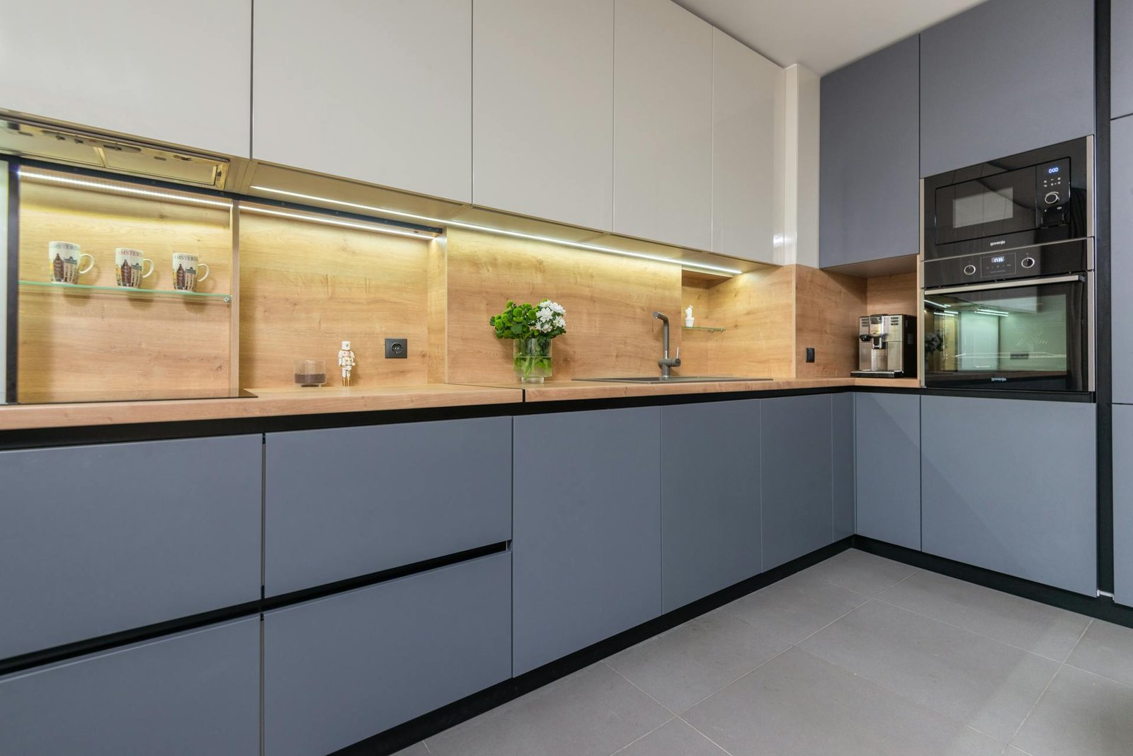 مطبخ ألمنيوم رمادي مع أسطح من الرخام الطبيعي