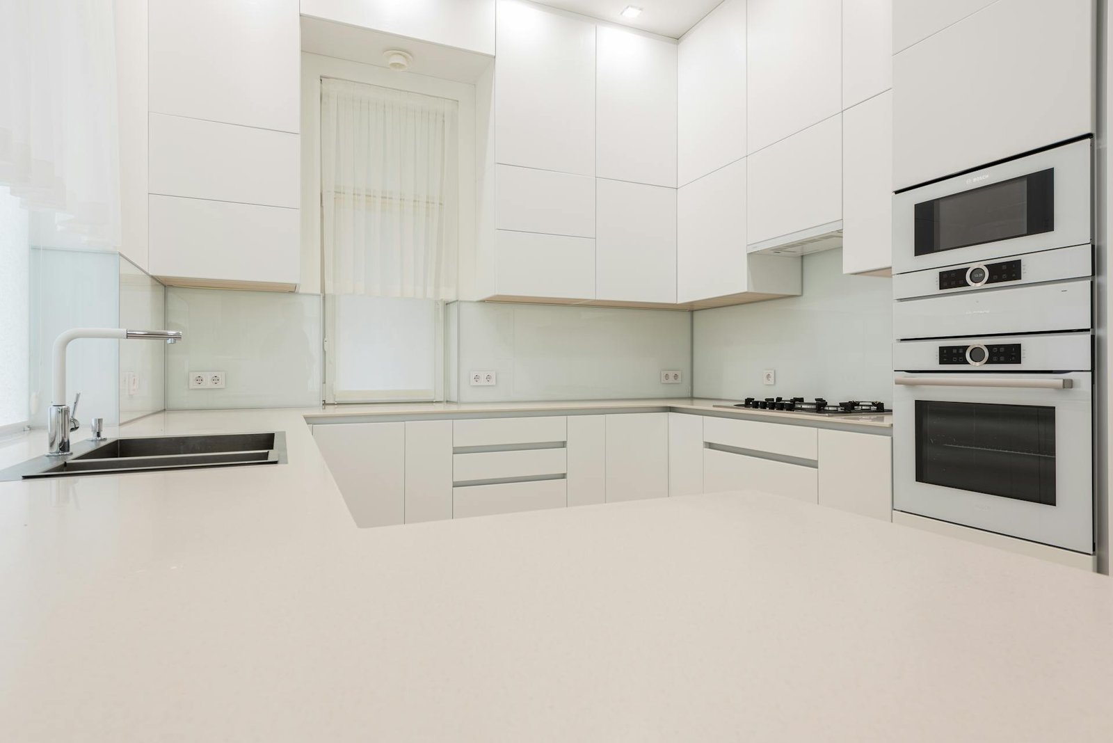 مطبخ ألمنيوم أبيض مع أسطح من الرخام الطبيعي