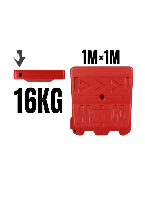 حواجز بلاستيك لتنظيم الطرق مصنوعة من مادة HDPE، بمقاس 1×1 متر ووزن 16 كجم فارغ، مزودة بفتحة علوية للتعبئة بالماء أو الرمل مع سدادة محكمة، وقواعد عريضة لثبات أعلى ومقاومة للرياح. تتوفر بألوان: أحمر، أصفر، برتقالي، وتستخدم لتنظيم المرور، فصل المسارات، وتأمين مواقع العمل والمواقف والفعاليات.